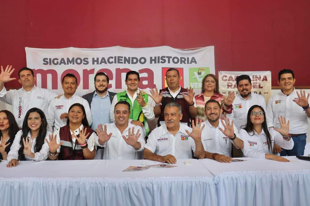 Diego Hernández, enlace político de Claudia Sheinbaum en Michoacán, Juan Pablo Celis presidente estatal de morena así como sus homólogos Ernesto Nuñez del Partido Verde y Eduardo Antón delegado del PT, fueron testigos del acuerdo convocado por el Prof. Raúl Morón Orozco quien estuvo acompañado de Antonio Madriz suplente de Leonel Godoy, candidato a diputado por Lázaro Cárdenas, la también candidata al senado Celeste Ascencio, Carolina Rangel candidata del Dtto. 10 de Morelia, y las candidatas de los distritos locales Nalleli Pedraza del Dtto. 17, Giulianna Bugarini del Dtto. 11 y Marco Polo Aguirre del Dtto. 10, m por Fabiola Alanís candidata a diputada local por representación proporcional y Roberto Pantoja vocero de Claudia Sheinbaum en Michoacán.