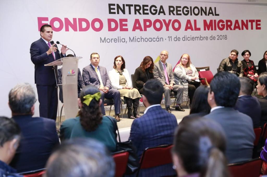 Morelia, Michoacán, a 11 de diciembre de 2018.- Vamos a seguir haciendo la parte que nos toca para generar mejores condiciones para nuestros hermanos y hermanas migrantes, pronunció el Gobernador Constitucional, Silvano Aureoles Conejo, al presidir la Entrega Regional de recursos del Fondo de Apoyo al Migrante (FAMI), con el que se favorecen 157 proyectos para 12 municipios, por un monto cercano a los 5 millones de pesos.
