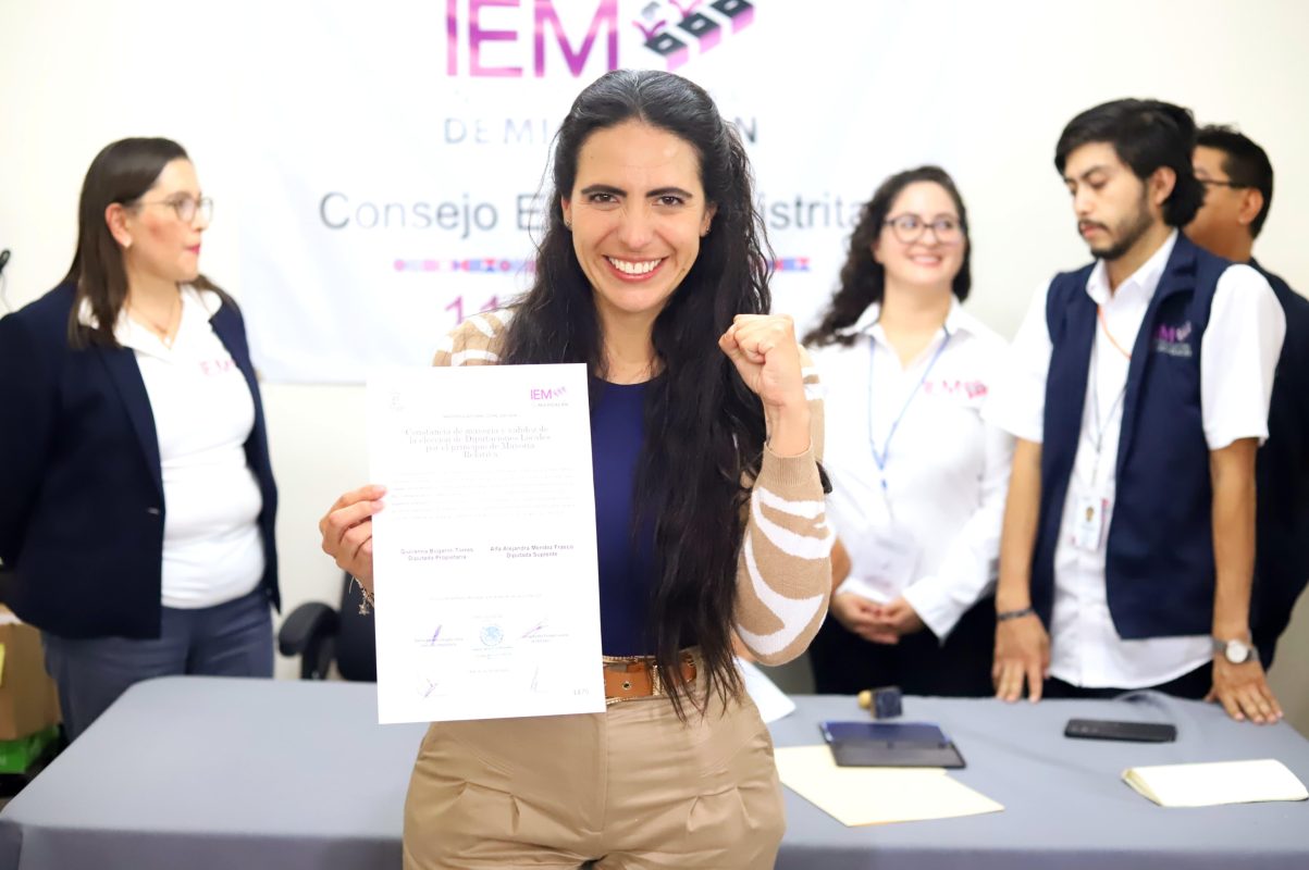Morelia, Mich., a 06 de junio de 2024.- Giulianna Bugarini, diputada electa por el distrito 11 de Morelia, recibió en manos de las autoridades electorales del IEM la constancia que la acredita su diputación al reiterar su triunfo con más de 35 mil votos.