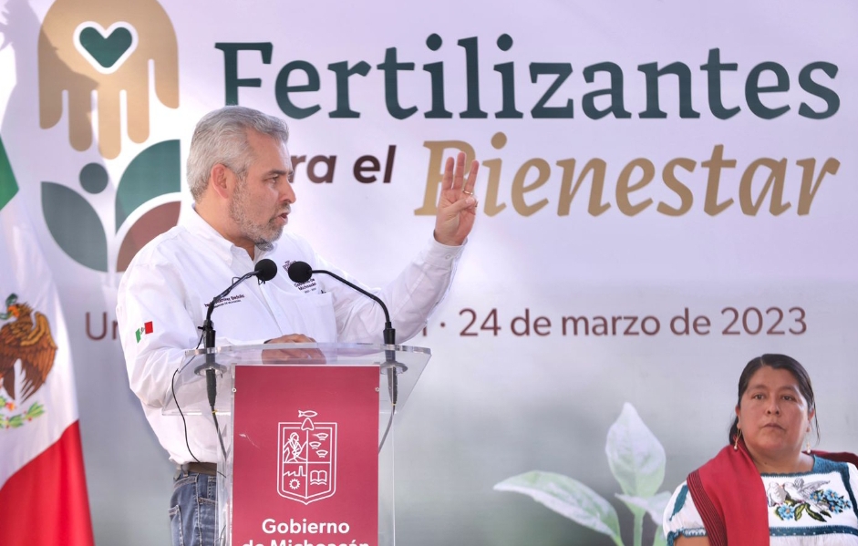 Uruapan, Mich., 24 de Marzo de 2023.- El gobernador Alfredo Ramírez Bedolla, entregó fertilizantes a pequeños productores agrícolas de la región de Uruapan, donde destacó que con este apoyo se concreta la promesa del presidente Andrés Manuel López Obrador, de fortalecer el campo michoacano.