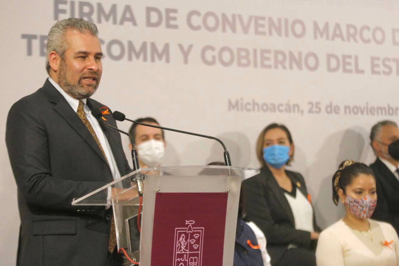Morelia, Mich., 25 de noviembre del 2021.- Tras firmar un convenio con Telecomunicaciones de México (Telecomm), el gobernador Alfredo Ramírez Bedolla señaló que se aprovechará la infraestructura de este organismo descentralizado de la federación para hacer llegar a un mayor número de michoacanos los programas de apoyo social.