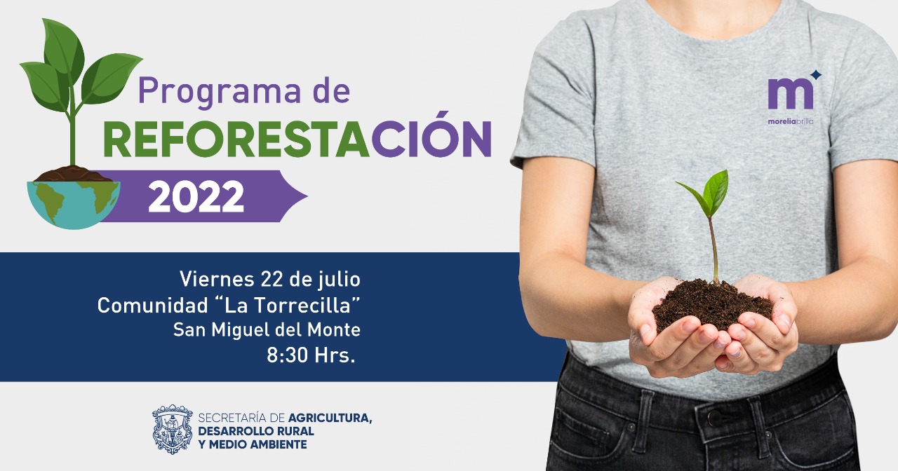 Morelia, Mich., a 20 de julio del 2022.- Dentro del Programa de Reforestación 2022 que la Secretaría de Agricultura, Desarrollo Rural y Medio Ambiente de Morelia (SADERMA), puso en marcha el pasado 9 de julio reforestando 5 mil árboles, se invita a la ciudadanía en general, ya sean organizaciones, asociaciones ambientalistas, instituciones y/o público en general que deseen unirse a la próxima reforestación que se llevará a cabo el día viernes 22 de julio a las 8:30 horas en la comunidad «La Torrecilla», perteneciente a la tenencia de San Miguel del Monte.