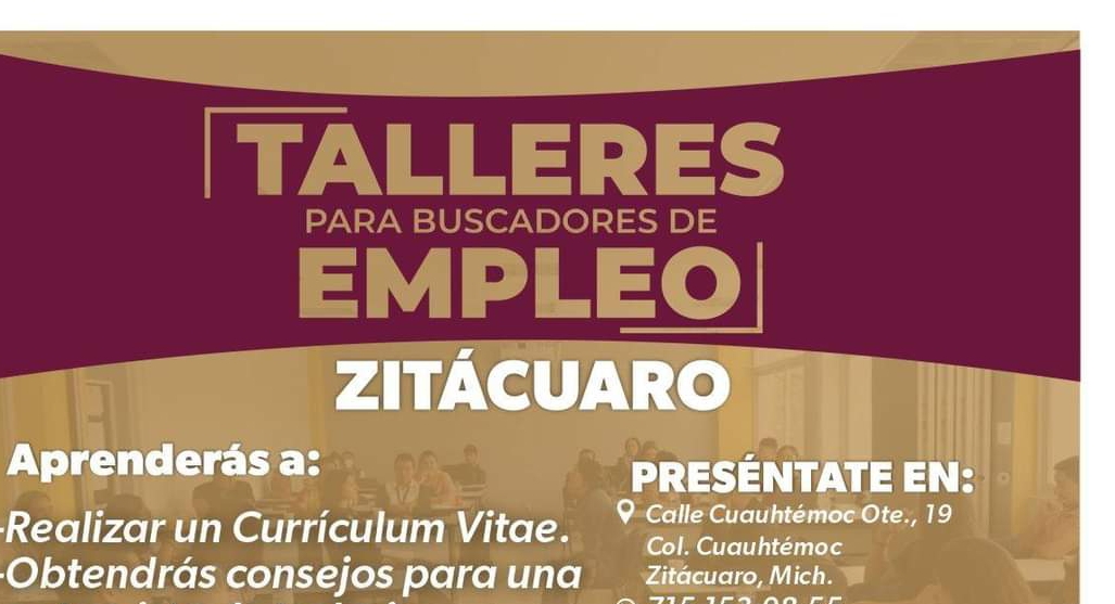 El jueves 13 de abril se llevará a cabo Taller para Buscadores de Empleo en Morelia, a las 10:00 horas, en avenida Lázaro Cárdenas 866, colonia Ventura Puente; información vía WhatsApp en el número 4431 009526. El mismo día, pero en La Piedad, se ofrecerá de manera presencial, a las 10:00 horas, en calle Tulipanes número 87, colonia Obrera; para mayor información en el número 353 52282 70.