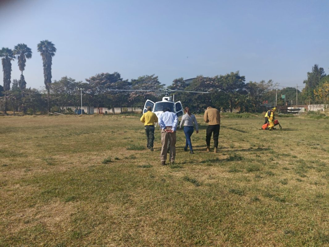 Uruapan, Mich., 2 de Mayo de 2024.-Desde esta mañana arribó a Uruapan el helicóptero con helibalde del Gobierno de Michoacán para atender el incendio forestal que se registra en el área de montaña del Parque Nacional Barranca del Cupatitzio.