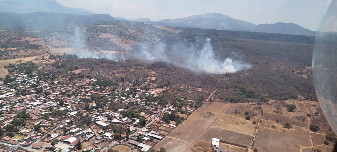 Por tierra realizan brechas corta fuego para contener las llamas y por aire el helicóptero de la Dirección de Servicios Aéreos de la Secretaría de Seguridad Pública (SSP) realiza un sobrevuelo de valoración y reconocimiento para una posible intervención.