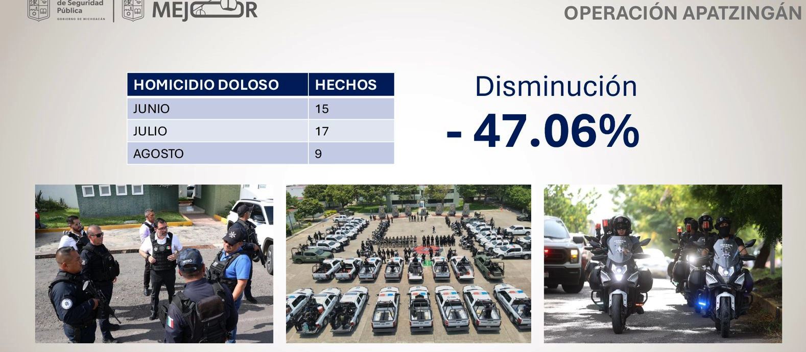 Detalló que durante los últimos meses, la incidencia de homicidios dolosos ha mostrado una tendencia a la baja. En junio se presentaron 15, en julio 17 y en agosto 9, como resultado de la Operación Apatzingán, donde participan las secretarías de Seguridad Pública (SSP) y de la Defensa Nacional (Sedena), así como de la Fiscalía General del Estado (FGE) con labores terrestres y aéreas.