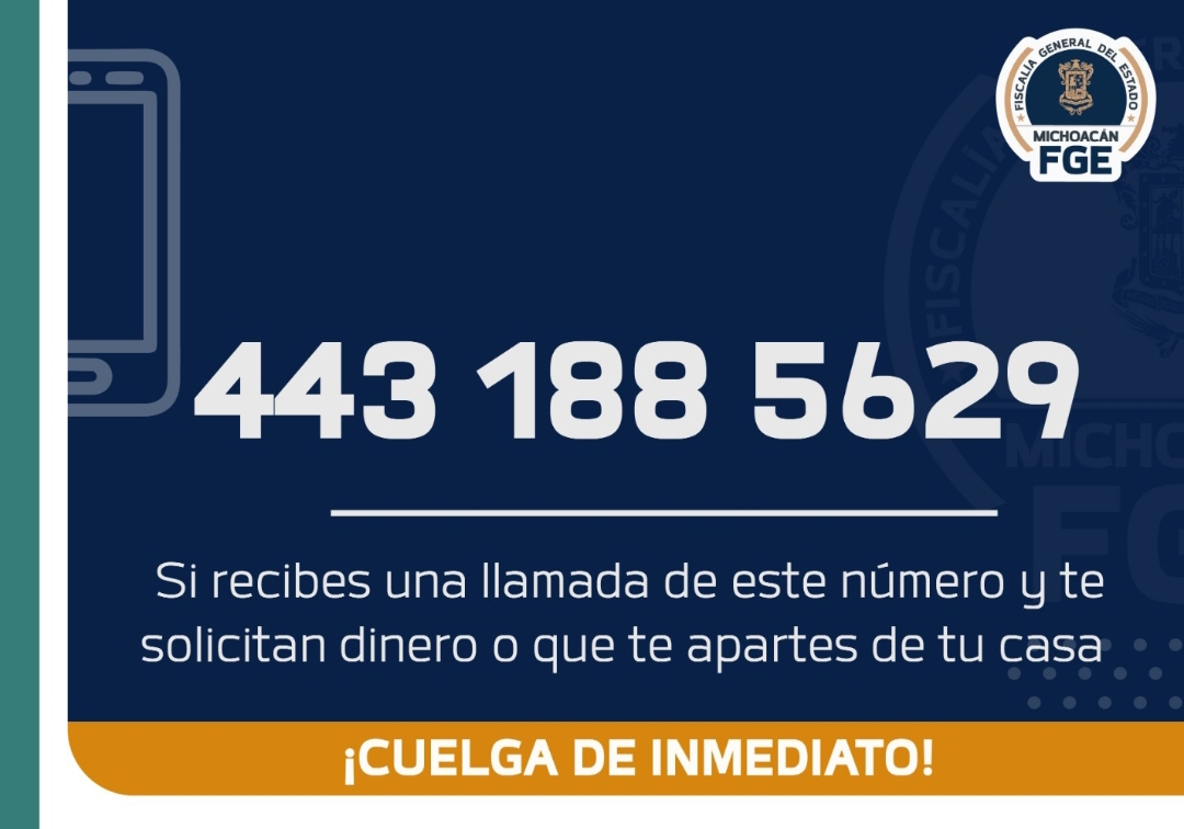 La FGE solicita a la población no atender este tipo de llamadas, y denunciarlas de forma inmediata ante la Fiscalía Regional más cercana, o bien a la Unidad Especializada de Combate al Secuestro, ubicada en Periférico Independencia #5000, colonia Sentimientos de la Nación en Morelia, o comunicarse al teléfono 443 322 36 00 extensión 2234.