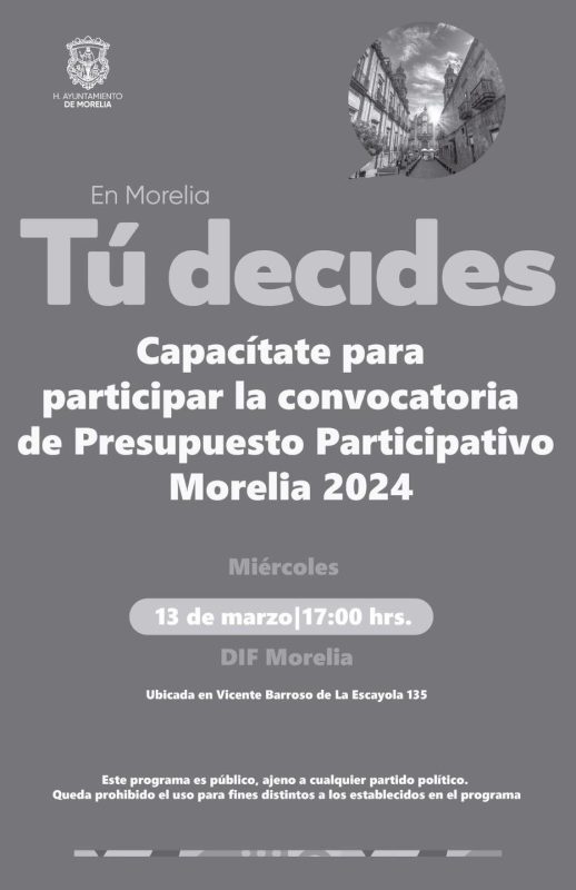 Morelia, Mich 11 Marzo del 2024.– El Instituto Municipal de Planeación de Morelia (IMPLAN) extiende una cordial invitación a las y los morelianos para participar en las sesiones de capacitación destinadas a la elaboración de proyectos ciudadanos que aborden diversas áreas de interés, como actividades económicas, sociales, culturales, deportivas, educativas, de transporte y abastecimiento.