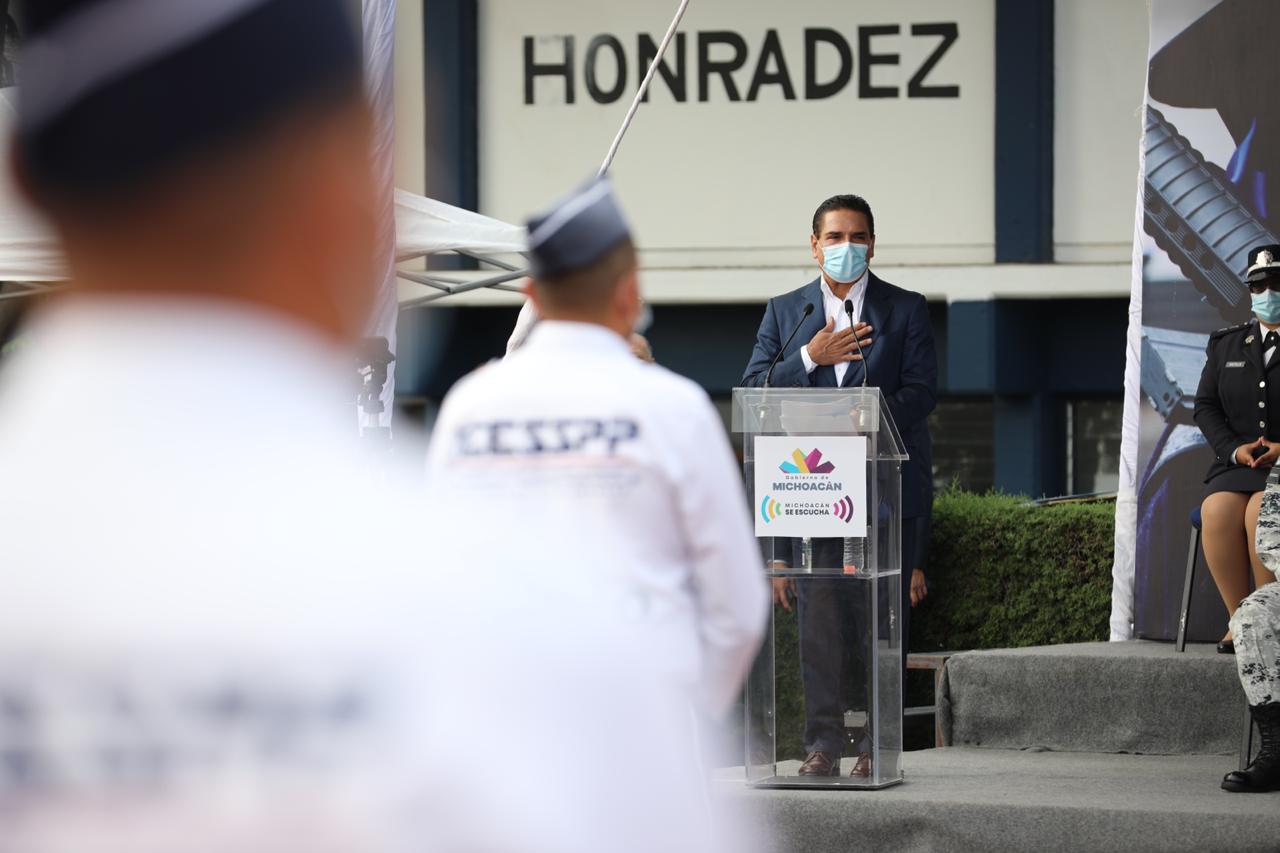 Destacó que en Michoacán se han dado pasos importantes para fortalecer la labor policiaca, mejorar el salario de los elementos de seguridad pública y equipar a las instituciones con armamento y vehículos.