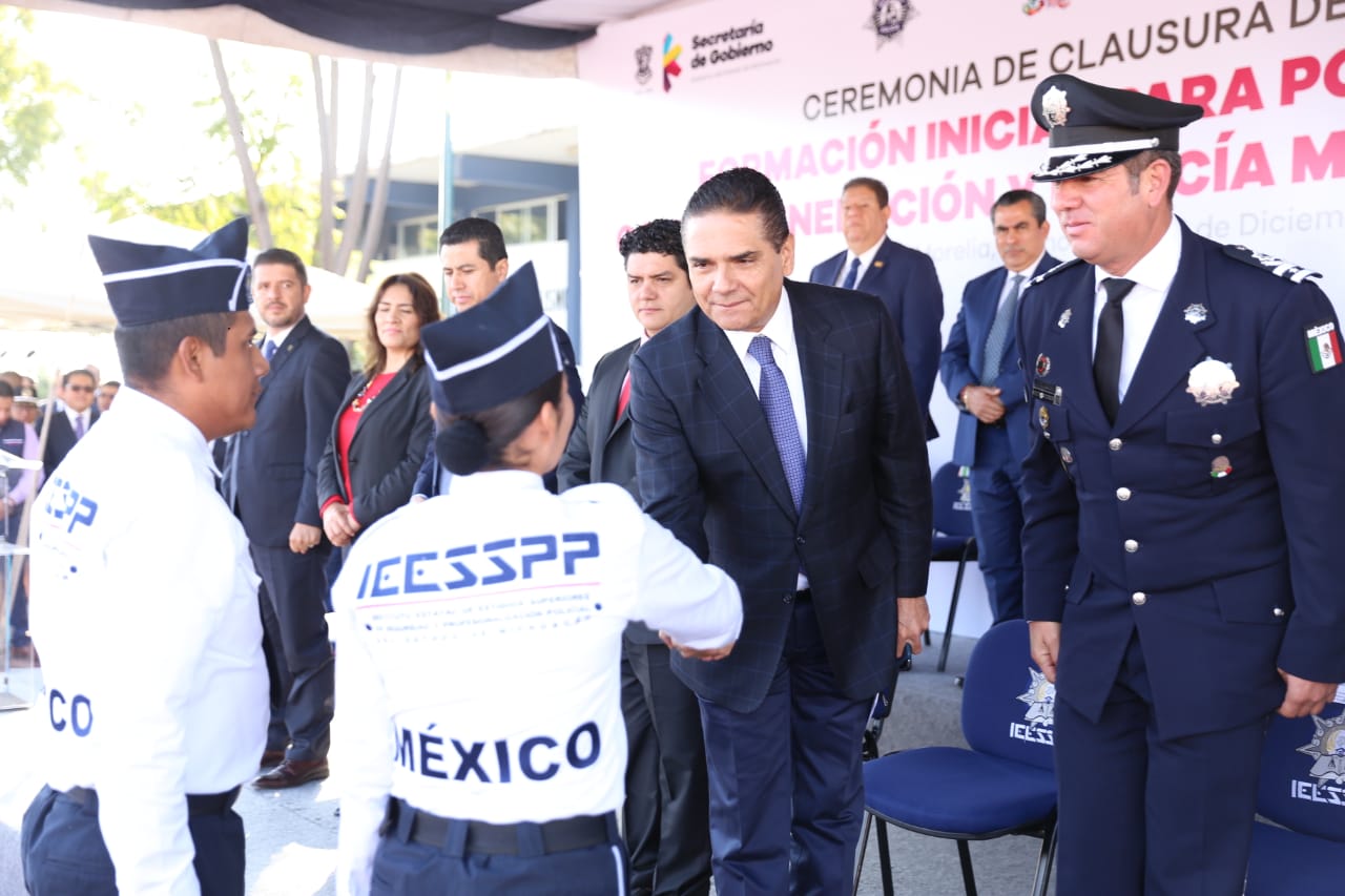 Este avance lo compartió el gobernador, al encabezar la ceremonia de clausura de los Cursos de Formación Inicial para Policía Michoacán, Octava Generación y Policía Municipal de Tarímbaro, en el Instituto Estatal de Estudios Superiores en Seguridad y Profesionalización Policial (IEESSPP).
