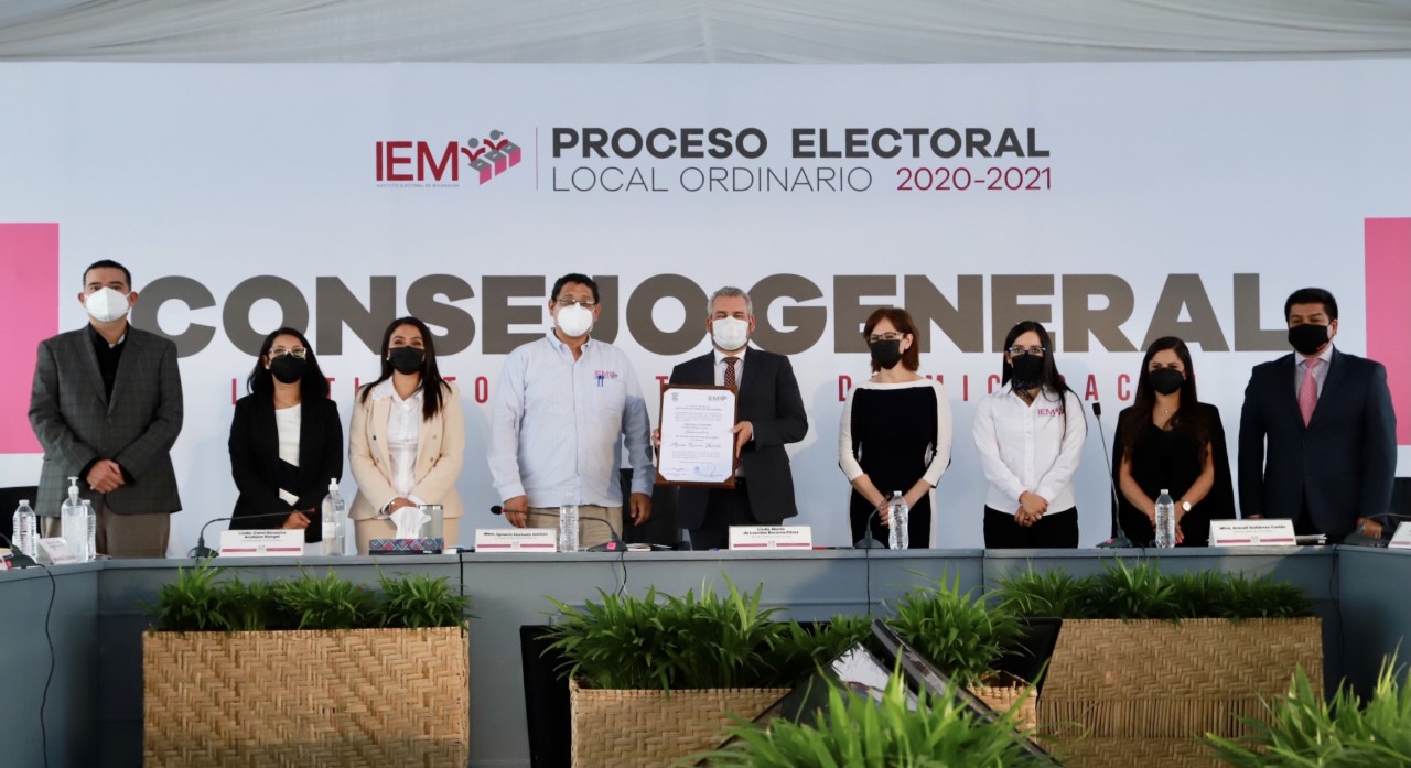 Morelia, Mich., a 14 de Junio de 2021. Con una participación del 49.7 por ciento de los ciudadanas y ciudadanos registrados en la lista nominal para el Proceso Electoral Local Ordinario 2020-2021, consejeros y consejeras del Instituto Electoral de Michoacán (IEM), hicieron entrega de la Constancia de Mayoría al candidato Alfredo Ramírez Bedolla, postulado por la coalición “Juntos Haremos Historia en Michoacán”,