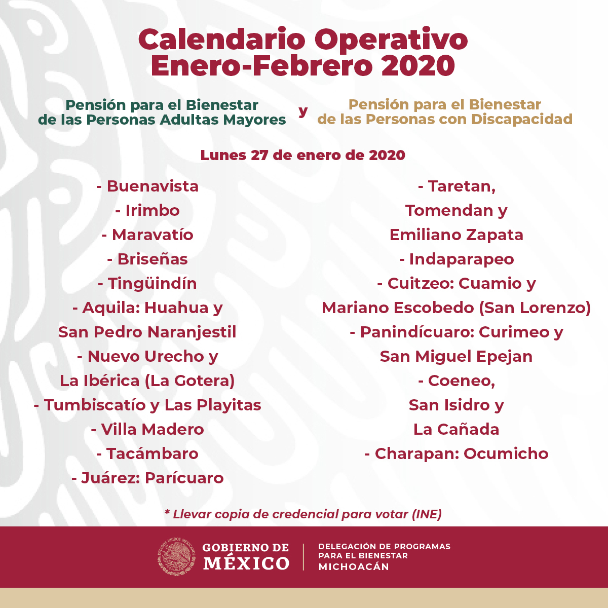 Morelia, Michoacán a 26 de enero de 2020.- Con la finalidad de revertir las profundas desigualdades sociales y mejorar la calidad de vida de las personas, la Delegación de Programas para el Bienestar Michoacán, arrancará este lunes el primer operativo de pago del 2020 de los Programas Integrales implementados por el Gobierno Federal.