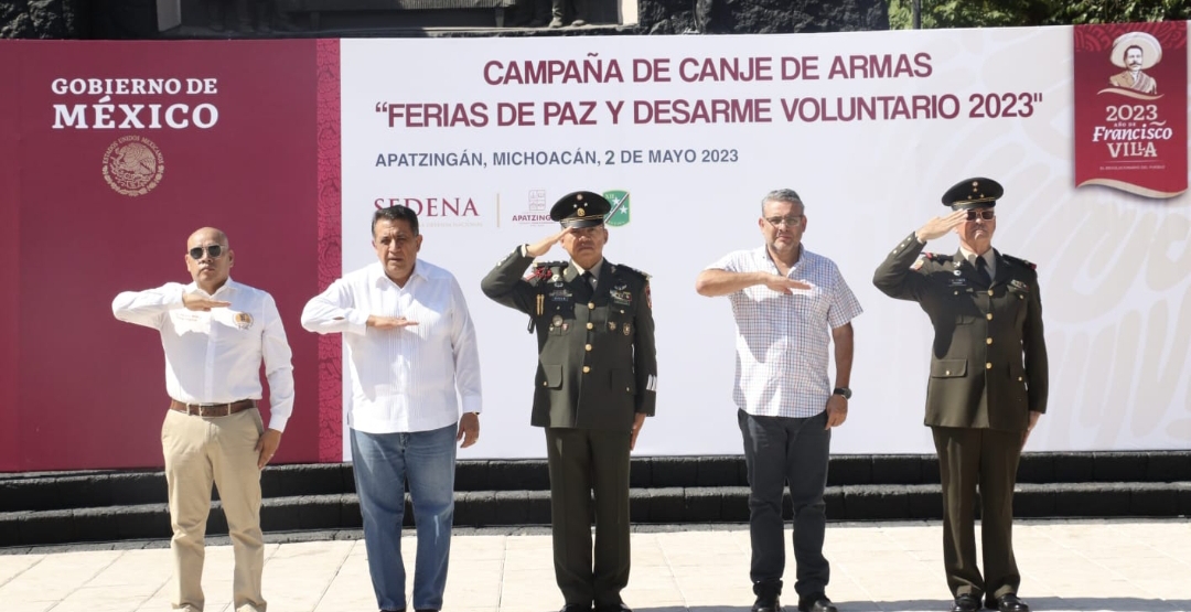 Apatzingán, Mich.- a 02 de Abril del 2023.- En el marco de la campaña “Ferias de Paz y Desarme Voluntario 2023” autoridades militares y del gobierno municipal, encabezaron la campaña desarme con la finalidad de exhortar a los ciudadanos que cuenta con armas en sus hogares puedan entregarlas de manera anónima.