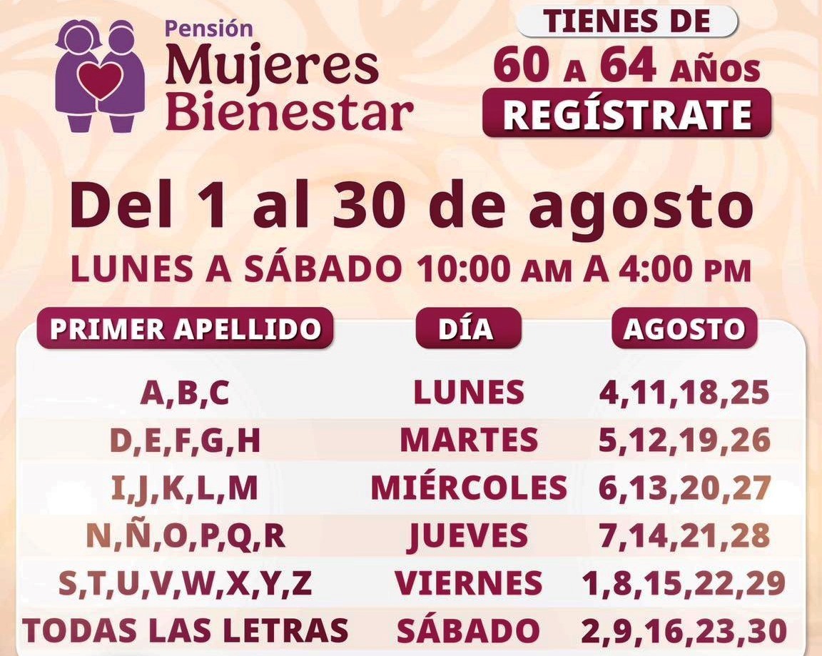 Ciudad de México, a 1 de Agosto del 2025.- La secretaria de Bienestar, Ariadna Montiel Reyes, informó que, en cumplimiento al compromiso de la Presidenta de México, Claudia Sheinbaum Pardo, del 1 al 30 de agosto se llevará a cabo el registro a la Pensión Mujeres Bienestar de 60 a 64 años, en todo el país.