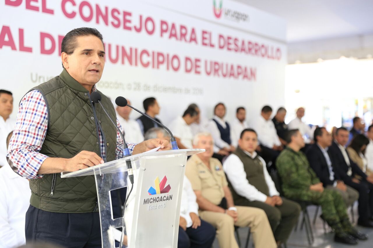 Uruapan, Mich, a 28 de diciembre de 2016.- A partir de hoy lo único que impera en Uruapan y en todo el estado es la ley y el respeto a las instituciones, por lo que pronto recuperaremos la paz y la estabilidad, así lo garantizó este miércoles el Gobernador Constitucional, Silvano Aureoles Conejo, durante la instalación del Consejo para el Desarrollo Integral de dicho municipio.