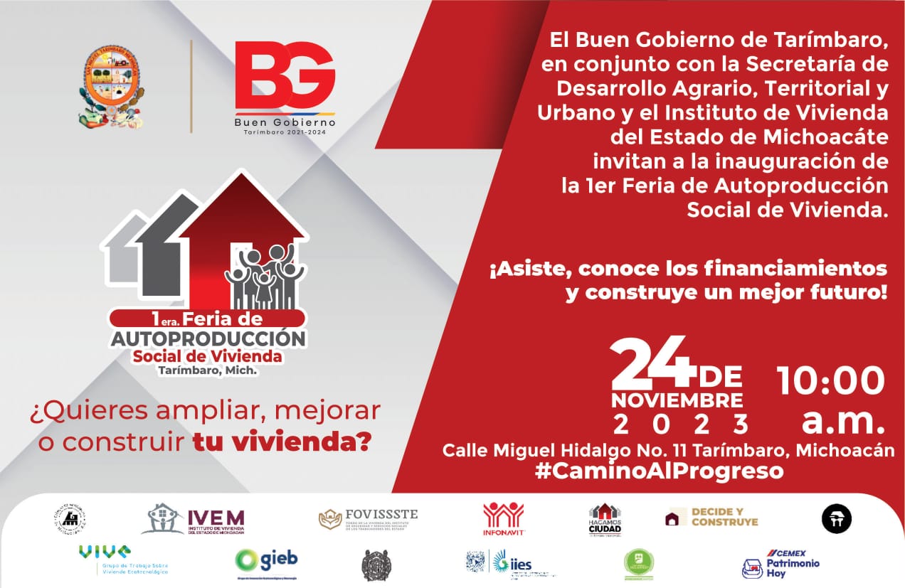 Tarímbaro, Mich., 21 de Noviembre de 2023.- En un esfuerzo conjunto entre dependencias federales, estatales y municipales, así como instituciones de crédito y casas de materiales locales, el municipio de Tarímbaro se complace en invitar a la ciudadanía a la «Primera Feria de Autoproducción de Vivienda Social». El evento se llevará a cabo el próximo viernes 24 de noviembre a las 10 de la mañana frente al Ayuntamiento de Tarímbaro.