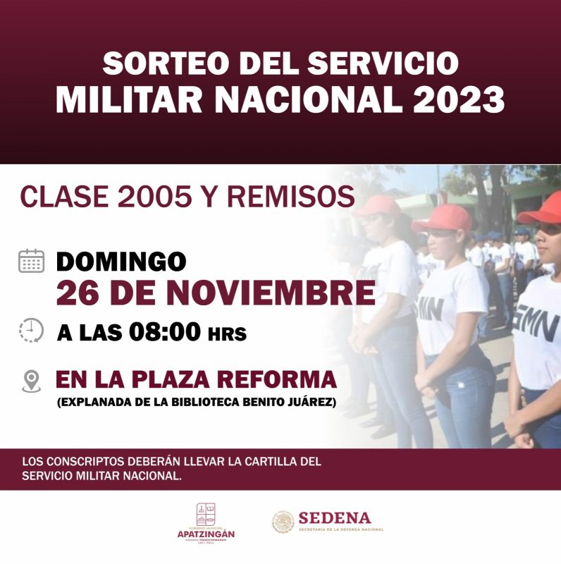 Apatzingán Mich a 08  de Noviembre de 2023.- La Junta Municipal de Reclutamiento y el 30 batallón de Infantería, llevarán a cabo el sorteo del Servicio Militar Nacional (SMN) de la clase 2005 y remisos, el próximo domingo 26 de noviembre, a las 08:00 horas, en la biblioteca pública “Benito Juárez”.
