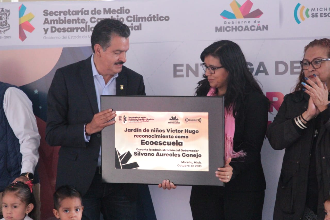 Morelia, Michoacán, a 29 de octubre de 2019.- El Gobierno de Michoacán, a través de la Secretaría de Medio Ambiente, Cambio Climático y Desarrollo Territorial (Semaccdet), reconoció al jardín de infantes “Víctor Hugo”, en Morelia, como la tercera institución educativa EcoEscuela Semaccdet.