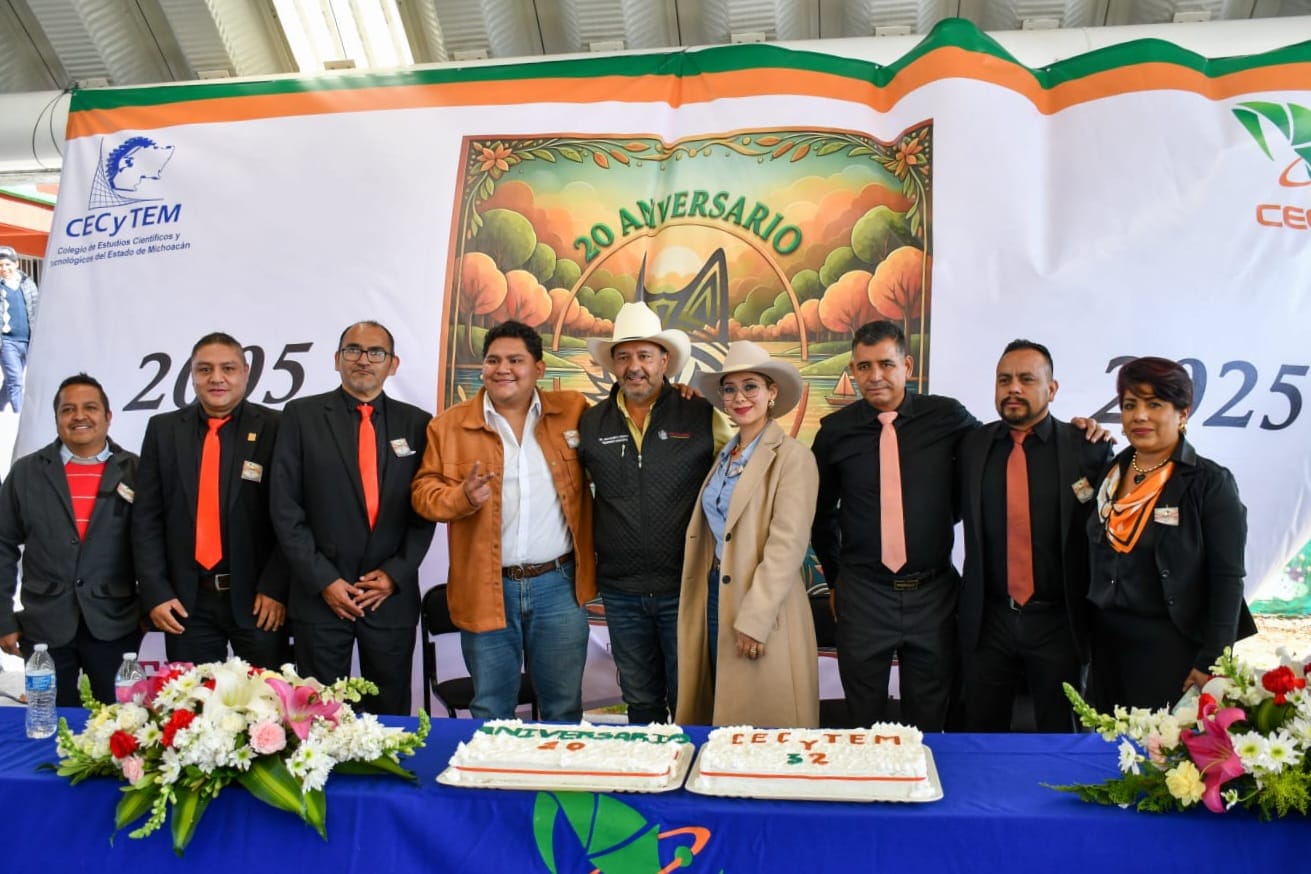 Pátzcuaro, Micho., a 6 de Diciembre de 2025.- El presidente municipal Julio Arreola encabezó la ceremonia del 20 aniversario del CECyTEM Plantel 32 Huecorio, donde reconoció el esfuerzo educativo de docentes, personal administrativo y estudiantes que, durante dos décadas, han contribuido a la formación de jóvenes con valores, disciplina y sentido de identidad comunitaria.