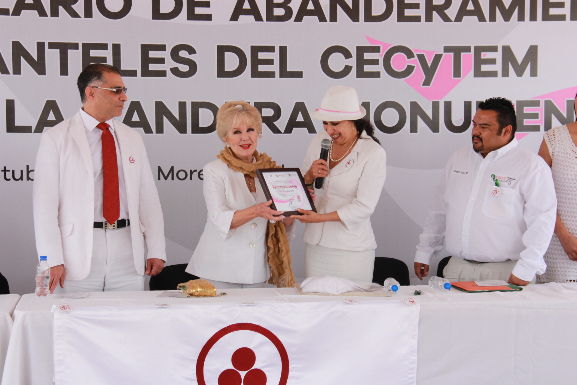 Asimismo, se reconoció a la actriz Alicia Rodríguez Fernández, quien ha dedicado 30 años de su vida a construir una cultura de paz entre los jóvenes difundiendo el mensaje del ilustre Nicolás Roerich y de la Bandera de la Paz. La homenajeada externó su beneplácito por regresar a la capital michoacana y abanderar a los siete planteles del CECyTEM que restaban por su sumarse a esta iniciativa.