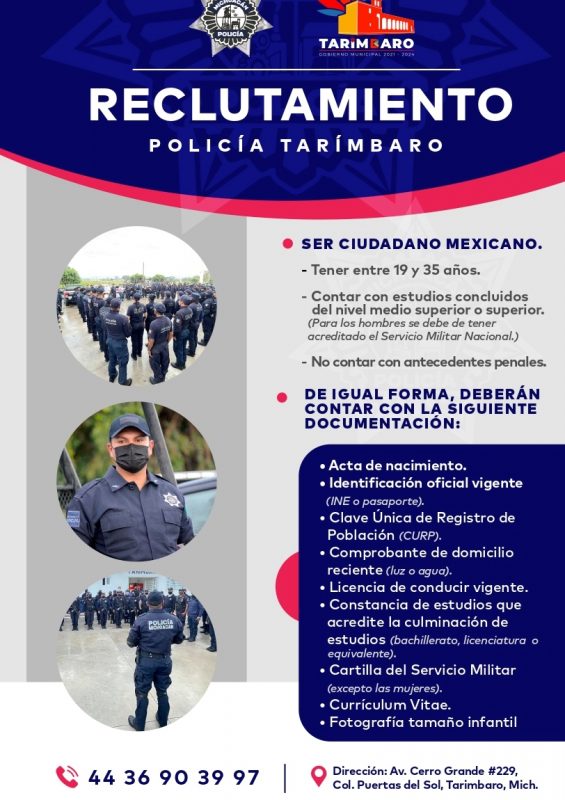 Tarímbaro, Michoacán, a 21 de Septiembre de 2021.- Con el objetivo de fortalecer la fuerza policial en Tarímbaro, la Secretaría de Seguridad Pública (SSP) convoca a hombres y mujeres con vocación de servicio, honestidad y respeto a formar parte de la Policía Municipal de Tarímbaro.