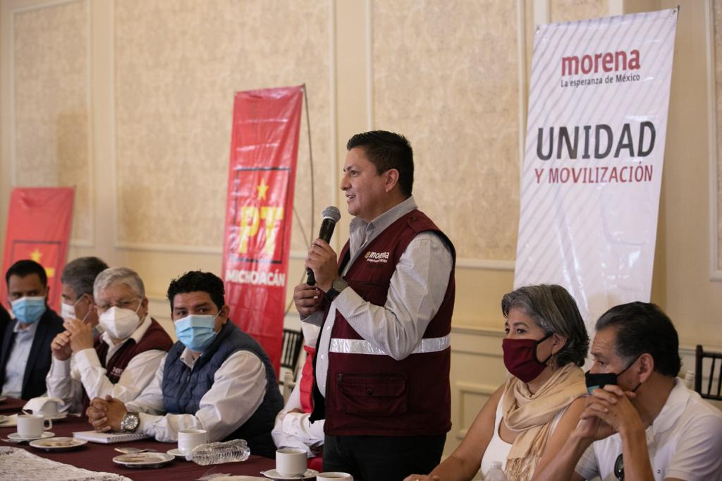 Morelia Mich. a 27 de Marzo de 2021.- Con la presencia de liderazgos del partido, Raúl Morón Orozco, coordinador de la Defensa de la 4T en Michoacán, recibe el apoyo de los protagonistas del cambio verdadero en la entidad y detallan la estrategia con la cual se devolverá a las y los michoacanos la candidatura de la esperanza.