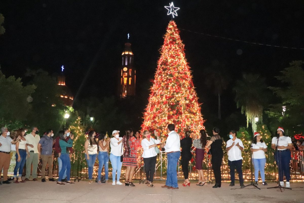 Apatzingán, Mich., a 02 de Diciembre del 2021.- La magia de la navidad se sintió en los corazones de cientos de apatzinguenses que se dieron cita en el centro histórico para presenciar el encendido del árbol e iluminación navideña, la cual estuvo a cargo del presidente municipal, José Luis Cruz Lucatero y la presidenta del DIF, Minerva Guízar Brito, quienes invitaron a los ciudadanos a convivir con responsabilidad las fiestas decembrinas.