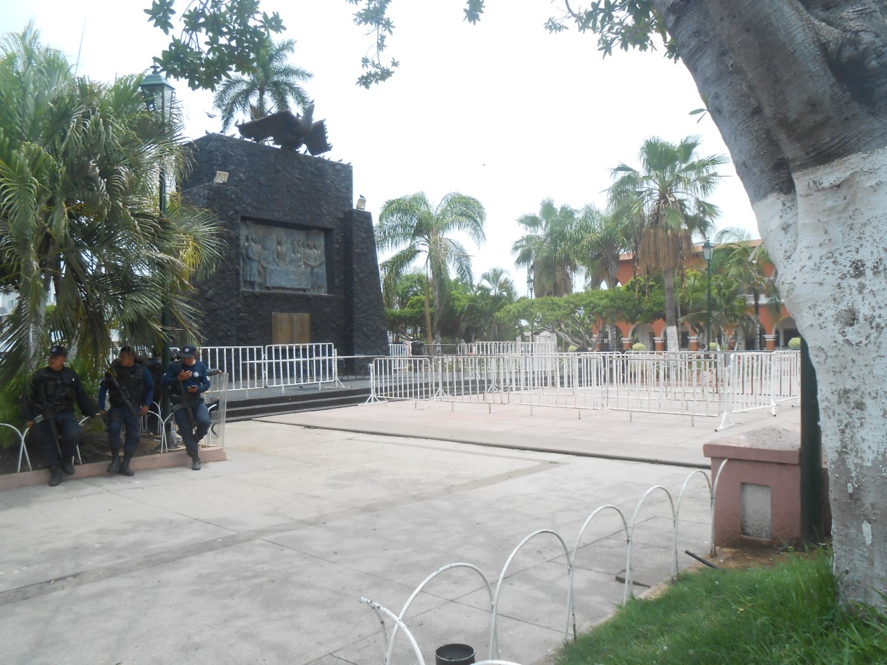 Apatzingán, Mich., a 03 de Junio del 2016.,- Mientras se montaba el cuadro o se aparentaba que se esperaba a los maestros que figuraban en la lista para pagarles en la Plaza de los Constituyentes, que permanecía custodiada por elementos de la Policía Michoacán y por momentos hasta por el Ejército Mexicano, empleados de la Secretaría Estatal de Educación Pública, movilizados a bordo de un helicóptero cumplieron con esa función entre el viernes, el sábado y ayer domingo en el edificio de la Escuela Primaria del poblado Los Hornos, distante unos diez kilómetros de esta ciudad rumbo a Aguililla.