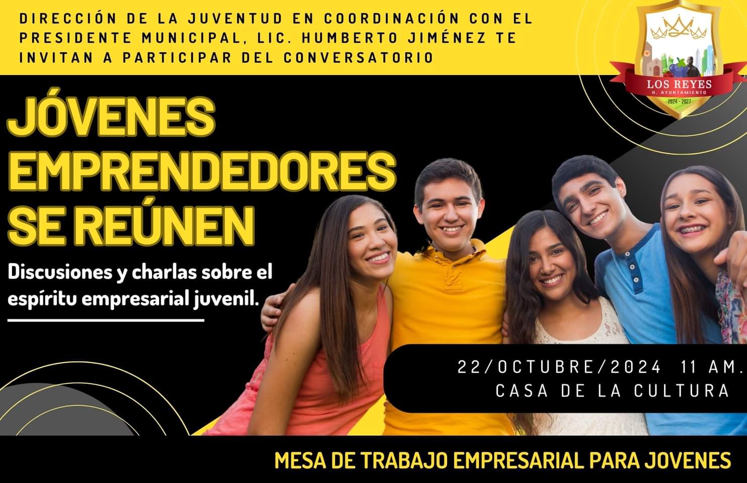 Los Reyes, Mich., a 21 de Octubre de 2024.– Con el objetivo de fomentar la vinculación y la colaboración interinstitucional en beneficio de la juventud, el presidente municipal de Los Reyes, Humberto Jiménez Solís, en coordinación con la Dirección de la Juventud, invita a todos los jóvenes del municipio a participar en el conversatorio titulado «Jóvenes Emprendedores se Reúnen».