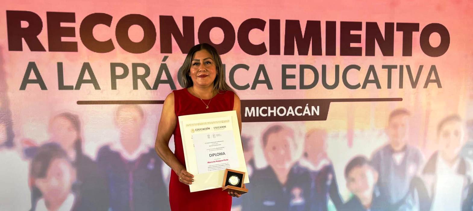 Morelia, Mich., 11 de Enero de 2025.-  La maestra Marcela Huapeo Peña, de la escuela primaria José María Morelos en Morelia, es una de las galardonadas con la Medalla a la Práctica Educativa, un distintivo que honra a los docentes cuya labor trasciende las aulas y contribuye significativamente al desarrollo integral de los estudiantes.