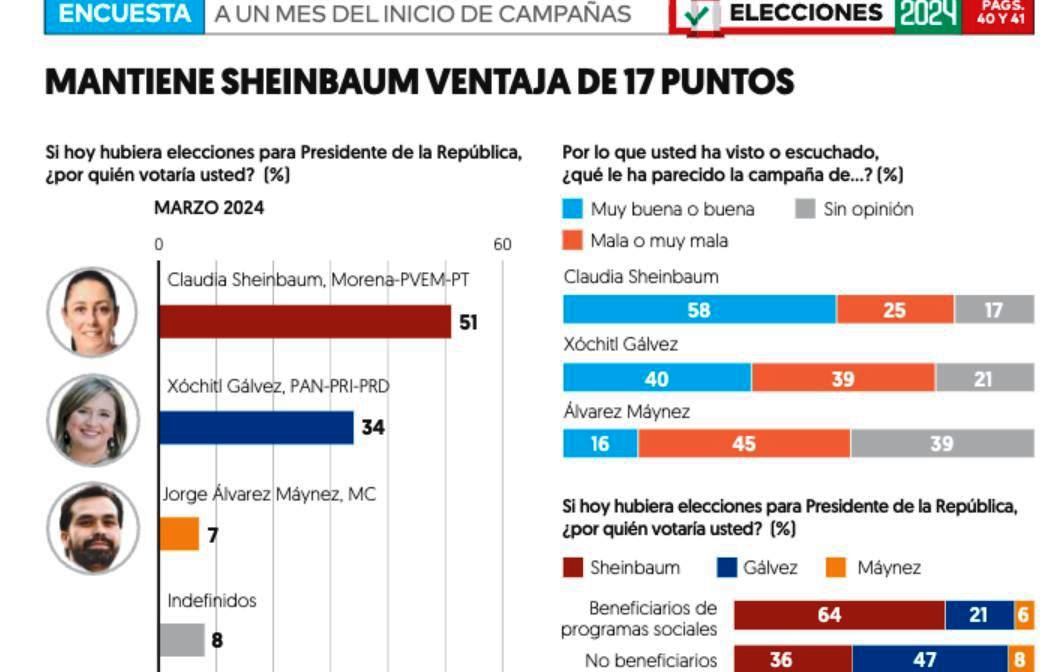 El sondeo indica que las preferencias casi no se movieron en el primer mes de campañas, registrando variaciones de apenas 1 punto porcentual en el apoyo que obtiene cada una de las candidatas y el candidato a la Presidencia respecto del mes anterior. No obstante, el apoyo que las candidatas punteras captan entre la población que recibe apoyos o beneficios de programas sociales y la que no obtiene esos apoyos denota dos escenarios: entre el electorado beneficiario de programas sociales, Sheinbaum obtiene 64% de la intención de voto y Gálvez 21%, una diferencia de 43 puntos.