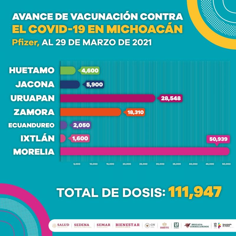 Morelia, Mich., a 29 de Marzo de 2021.- Michoacán registra una aplicación de 228 mil 485 dosis anti COVID-19 a los adultos mayores de 60 años, pertenecientes a 38 municipios.