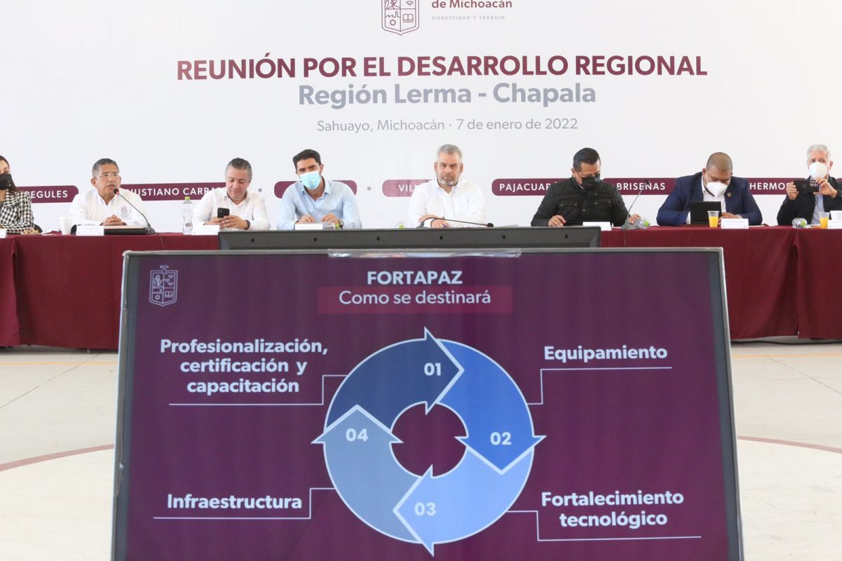 Sahuayo, Mich., a 7 de Enero del 2022.- El gobernador del estado Alfredo Ramírez Bedolla, en compañía del titular de la Secretaría de Seguridad Pública (SSP), General José Alfredo Ortega Reyes, así como de otras autoridades estatales, municipales y los representantes de la Secretaría de la Defensa Nacional (Sedena), y de la Guardia Nacional (GN), sostuvieron diversas reuniones de trabajo para mejorar las condiciones de seguridad en la región Lerma-Chapala. Con el objetivo de reforzar el esquema de vigilancia para disuadir los ilícitos, los representantes de gobierno realizaron una gira de trabajo en Jiquilpan, donde iniciaron sus actividades con una mesa de seguridad interinstitucional a través del Grupo de Inteligencia Operativa (GIO), para definir los sistemas operativos a implementar en mejora de la tranquilidad en la demarcación.El mandatario estatal en compañía del General Ortega Reyes dieron detalles sobre los beneficios que obtendrán los 12 municipios que integran la región a través del recurso denominado Fortapaz, mismo que se estructura principalmente en cuatro ejes, que son: profesionalización, equipamiento, infraestructura y fortalecimiento tecnológico. Estas demarcaciones son: Marcos Castellanos, Cojumatlán, Venustiano Carranza, Sahuayo, Jiquilpan, Villamar, Pajacuarán, Briseñas, Vista Hermosa, Cotija, Tocumbo y Tingüindín. Con ello, se resaltó el interés de generar entornos donde la sociedad esté libre de hechos delictivos con el fortalecimiento al rubro de la seguridad, mismo que se reflejará en las zonas consideradas como focos rojos, en los tramos carreteros, en el alumbrado público y en las áreas colindantes con otros estados de la República con la fuerte presencia policial y militar.