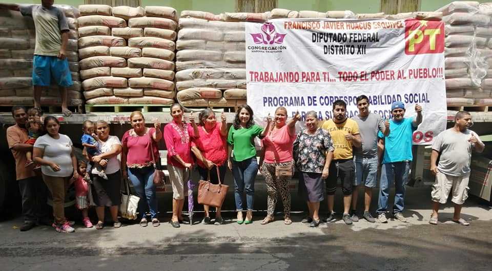 Es así durante esta semana la regidora del PT Blanca Azucena Álvarez Chávez, junto al legislador federal Francisco Huacus Esquivel, llevaron a efecto la entrega de 36 toneladas de cemento mortero, esto, a través del convenio signado con el programa de mejoramiento de vivienda de la Congregación Mariana Trinitaria.