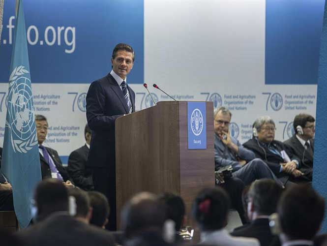 Frente al director general de este organismo de las Naciones Unidas, José Graziano da Silva, el presidente de Colombia, Juan Manuel Santos y representantes de diversas naciones del mundo, el mandatario mexicano recordó que Mesoamérica Sin Hambre arrancó como una iniciativa que comparte la experiencia nacional y recursos económicos a cinco naciones de centroamerica para atender el flagelo de la pobreza alimentaria.