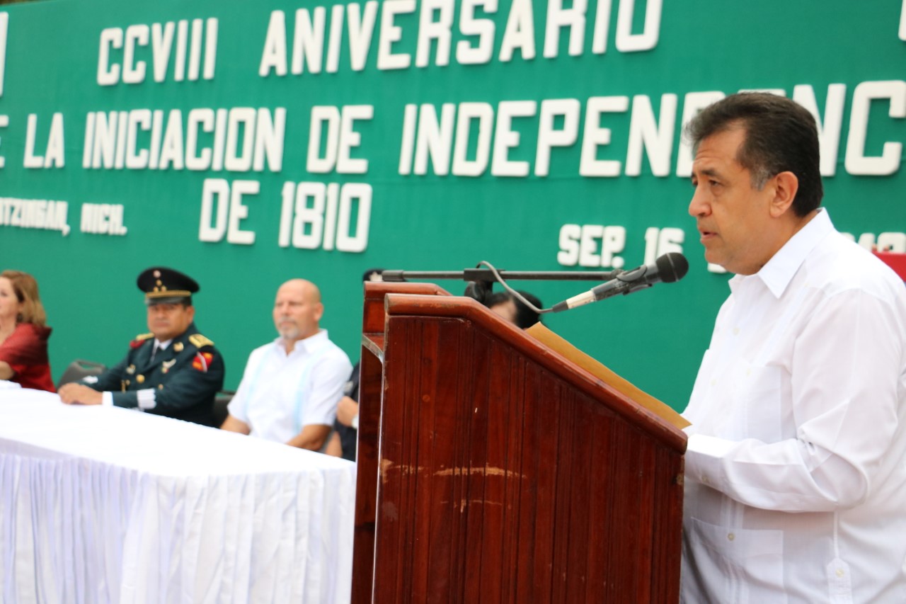 Apatzingán, Mich., a 16 de septiembre de 2018.- A 208 de la lucha por la independencia se puede decir que México tiene un territorio, una población y un gobierno independiente, en el concierto internacional de naciones, dotado de instituciones que garantizan la continuidad de un sistema político, económico y social, pronunció el presidente municipal, José Luis Cruz Lucatero durante el acto cívico de la Independencia de México.