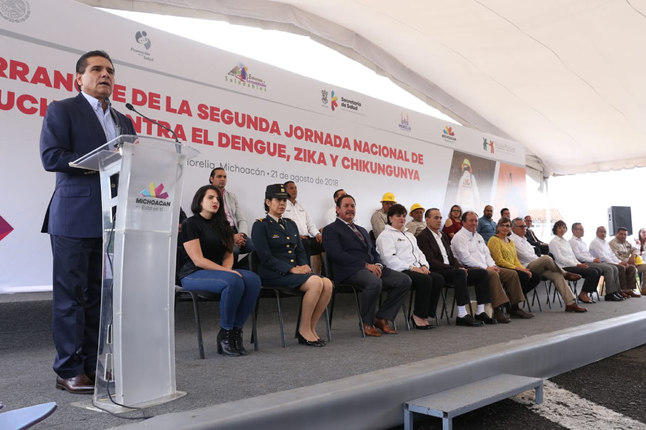 Morelia, Michoacán, a 21 de agosto del 2018.- El bienestar de las michoacanas y los michoacanos es prioridad para nuestra administración, sostuvo el Gobernador Constitucional Silvano Aureoles Conejo al dar arranque a la Segunda Jornada Nacional de Lucha contra el mosco del Dengue y Chikungunya, la cual se llevará a cabo del 20 al 24 de agosto, a través de las 8 Jurisdicciones Sanitarias y en los 113 municipios del estado.