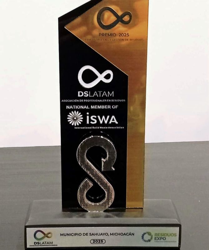Sahuayo, Mich, 21 de Abril de 2025.- La Asociación de Profesionales en Residuos (DS LATAM) otorgó el Premio a la Trayectoria en la Gestión de Residuos al estado de Michoacán, por establecer en Sahuayo estrategias y acciones orientadas a una política local en materia de prevención y gestión de residuos urbanos, con el Centro Intermunicipal para el Tratamiento Integral de los Residuos Sólidos (CITIRS).