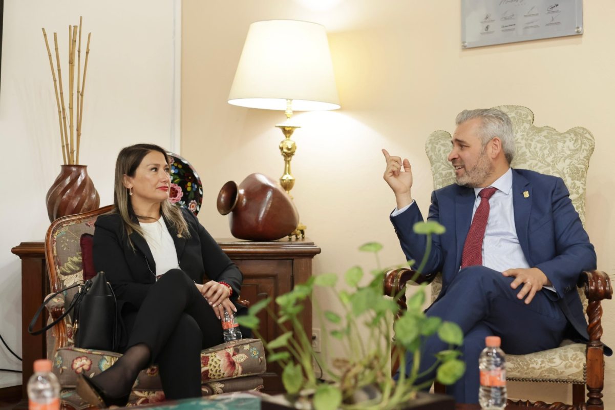 Morelia, Mich.,24 de Octubre de 2023.-El gobernador Alfredo Ramírez Bedolla, y la jefa de la Brigada Investigadora de Trata de Personas de la Policía de Investigaciones de Chile, Katherine Alejandra Vázquez, compartieron experiencias de programas y acciones para mejorar la seguridad y prevención de la violencia.