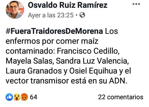 Y no se trata de una información tendenciosa sino que surge de la inconformidad de los militantes de Morena y entre ellos se encuentra Osvaldo Ruíz Ramírez, quien a través de su cuenta de Facebook catálogo como traidores y de comer maíz contaminado a los legisladores Sandra Luz Valencía; Francisco Cedillo; Osiel Equihua y Laura Granados.