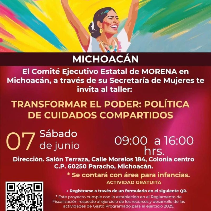 Morelia, Mich, a 6 de Junio del 2025.- El dirigente estatal de Morena en Michoacán, Jesús Mora González, en coordinación con la Secretaría de Mujeres del Comité Ejecutivo Estatal, convocó al curso-taller “Transformar el Poder: Política de Cuidados Compartidos”, que se llevará a cabo este sábado 7 de junio en el municipio de Paracho.