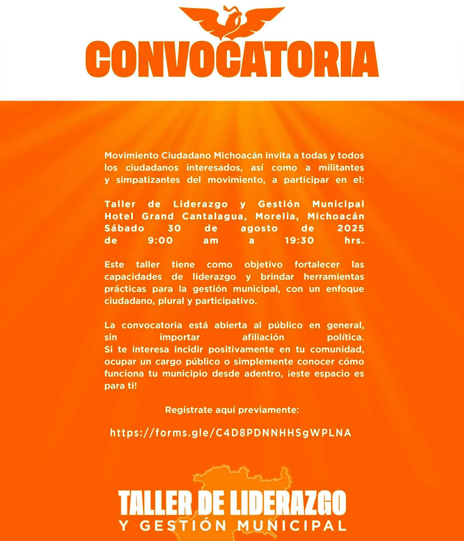 Morelia, Mich, a 30 de Julio del 2025.- Con el firme compromiso de seguir fortaleciendo liderazgos locales que impulsen un cambio real desde lo municipal, el coordinador estatal de Movimiento Ciudadano en Michoacán, Víctor Manríquez González, invitó a ciudadanas, ciudadanos, militantes y simpatizantes a participar en el Taller de Liderazgo y Gestión Municipal, que se llevará a cabo el 30 de agosto de 2025, en el Hotel Grand Cantalagua de Morelia, de 9:00 a 19:30 horas.
