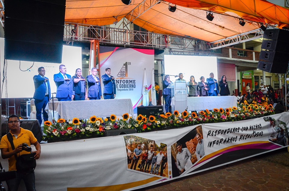 Tingambato, Michoacán, a 16 de agosto de 2019.-Al rendir su Primer Informe de Labores, el Presidente Municipal de Tingambato, Nelson Villegas Figueroa, subrayó que aún con la falta de recursos federales se están generando resultados a la ciudadanía.
