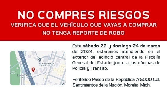 Derivado de un aumento en el número de eventos fraudulentos por la compra de vehículos, la institución brindará atención los días 23 y 24 de marzo, para la verificación y expedición del Certificado de No Reporte de Robo y No Alteración de Números de Identidad Vehicular, con la finalidad de garantizar certeza y seguridad en el patrimonio de las y los michoacanos.