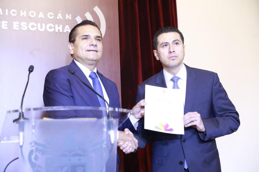Morelia, Michoacán, a 30 de julio de 2019.- Con el objetivo de consolidar la estrategia integral de seguridad y que Michoacán logre la meta de contar con la mejor policía del país, este martes el gobernador del estado, Silvano Aureoles Conejo, otorgó el nombramiento a Israel Patrón Reyes como secretario de Seguridad Pública de la entidad.