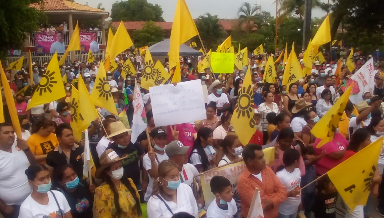 En el centro de la plaza de armas teniendo como testigos los monumentos del coronel Cenobio Moreno y de Don Alberto Aguilera Valadez; luego de una marcha arribaron los integrantes de la plantilla encabezada por Maritza García Franco y del candidato a Diputado Local por el distrito 22 con cabecera en Múgica, Iván Madero Naranjo.