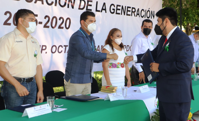 Morelia. Mich., a 10 de Octubre del 2020.La educación es la clave para reducir la desigualdad y generar oportunidades de desarrollo en nuestro país, resaltó el Presidente del Congreso de Michoacán, Octavio Ocampo Córdova al apadrinar a los alumnos del Instituto Superior Tecnológico de Huetamo, durante una ceremonia alusiva de graduación que contó con las medidas preventivas de cuidado por el Covid-19.
