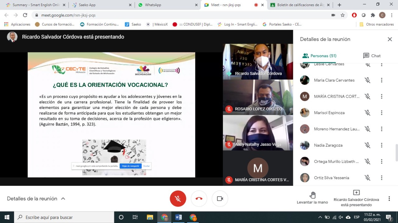 Penjamillo, Mich, a 8 de febrero de 2021.- Con el objetivo de brindarles orientación vocacional en la toma de decisiones a los 124 estudiantes que concluyeron el quinto semestre del plantel Penjamillo del Colegio de Estudios Científicos y Tecnológicos del Estado de Michoacán (CECyTEM), directivos del centro educativo llevaron a cabo el Webinar: “La importancia de la orientación vocacional”.