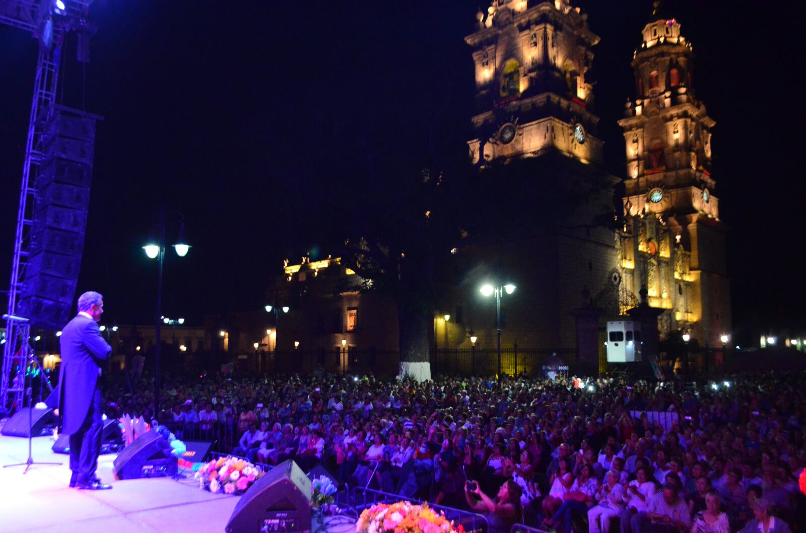 Morelia, Mich., a 18 de Mayo de 2017.-Con broche de oro cerró la jornada de celebración del 476 Aniversario de la Fundación de Morelia, al llevarse a cabo el magno concierto del Tenor, Fernando de la Mora, quien abarrotó el primer cuadro de la ciudad con la presencia de familias enteras: niñas, niños, jóvenes y personas de la tercera edad, quienes disfrutaron al máximo la sublime voz de este grande de la canción mexicana.