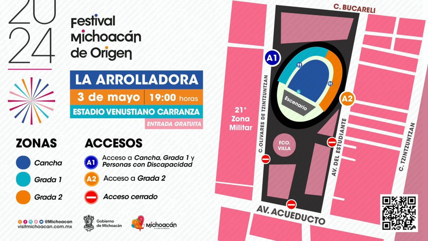 La Secretaría de Turismo de Michoacán (Sectur) recordó al público que también habrá cortes a la circulación en la calle Olivares de Tzintzuntzan y en avenida del Estudiante, por lo que invitó a tomar sus precauciones y llegar con tiempo para disfrutar del baile y las canciones que La Arrolladora comparta esta noche dentro del FMO 2024.